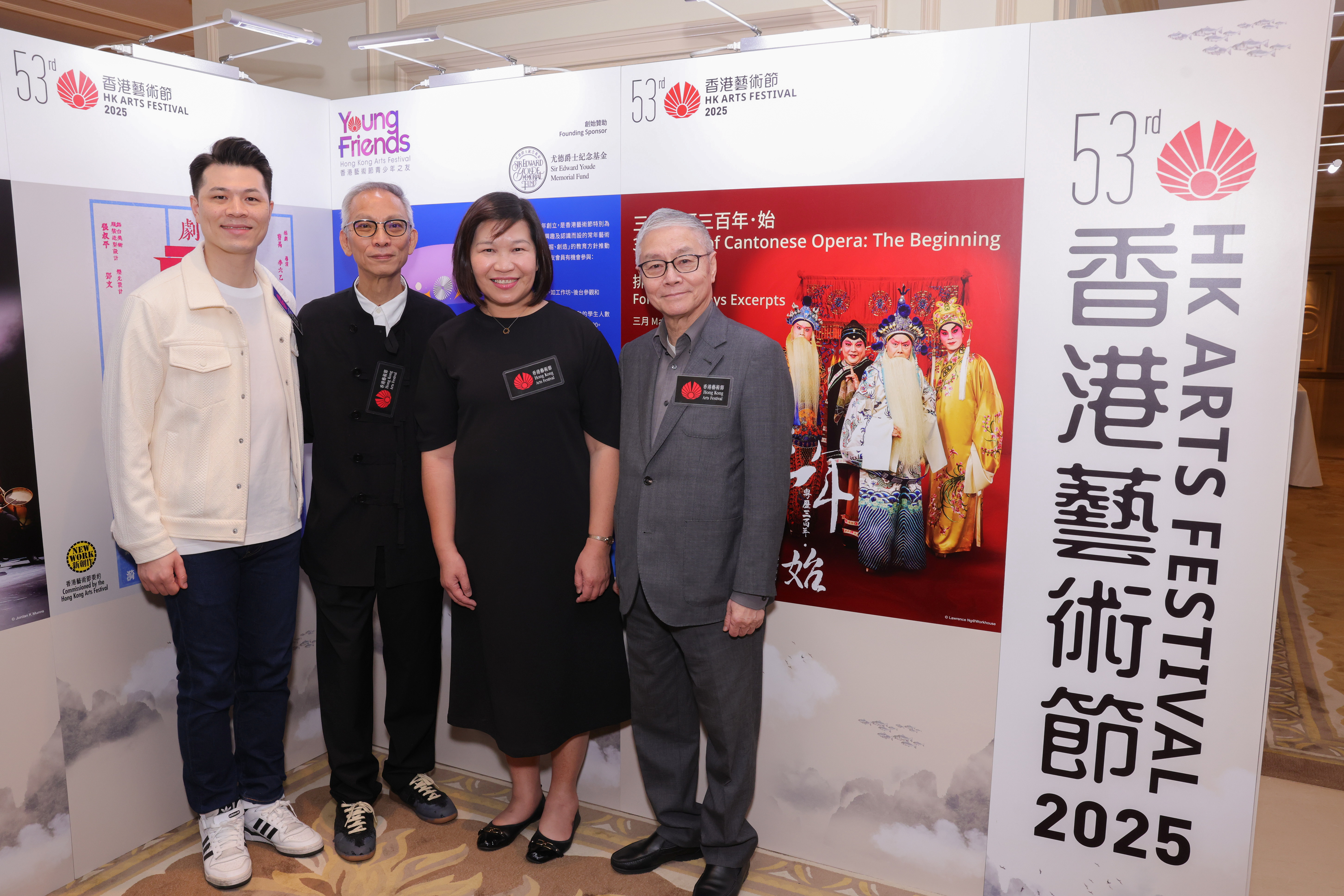 Mr. Yuen Siu-fai (first from the right), the artistic director and main cast, and Mr. Lam Tin-yau (first from the left), the main cast of 300 Years of Cantonese Opera: The Beginning pictured with Ms. Flora Yu, Executive Director of the Hong Kong Arts Festival Society (second from the right) and Mr. So Kwok-wan, Programme Director of the Hong Kong Arts Festival Society (second from the left).