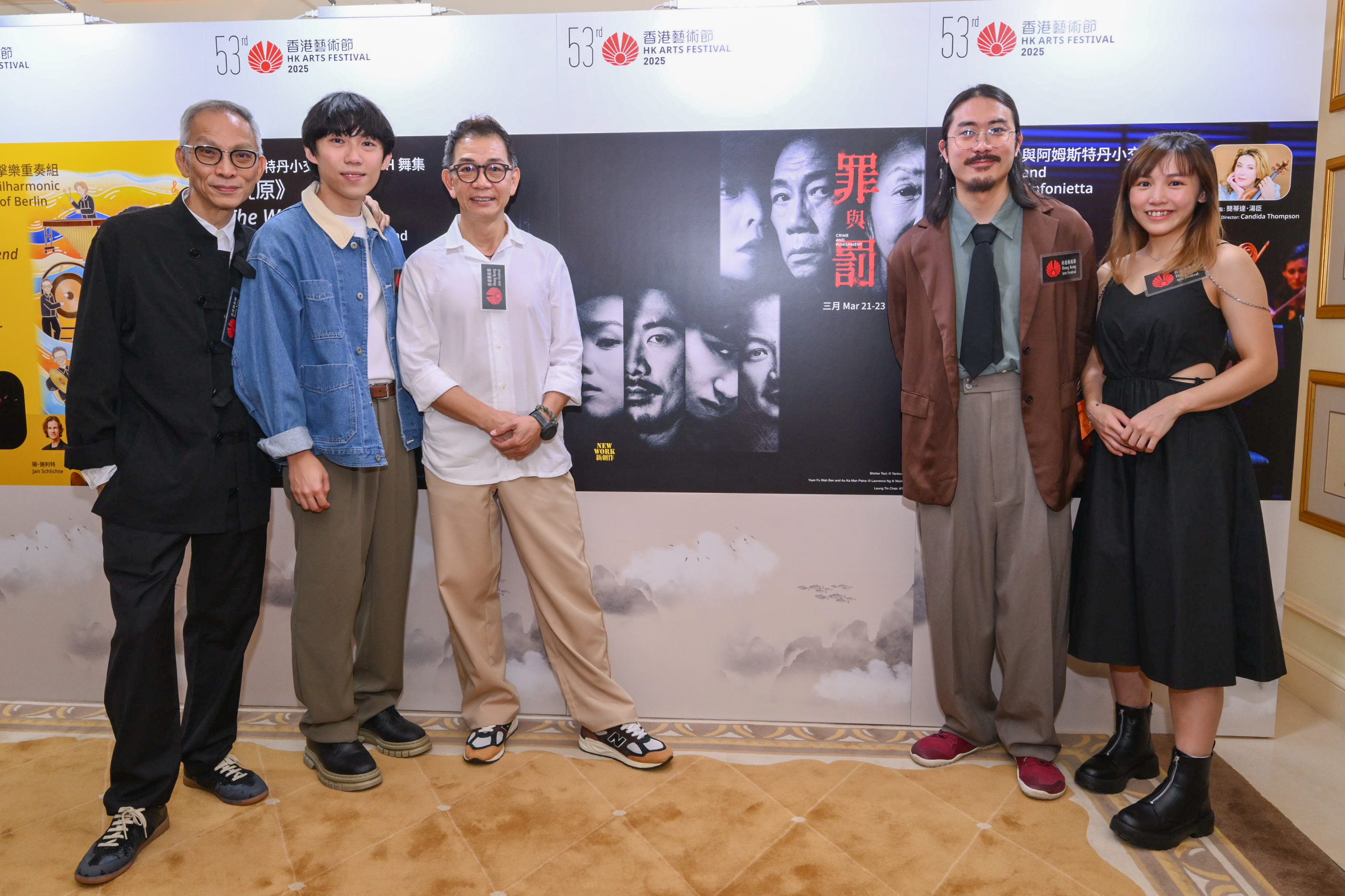 Mr. So Kwok-wan, Programme Director of the Hong Kong Arts Festival Society (first from the left) pictured with the main cast of Crime and Punishment, a new work commissioned and produced by the Hong Kong Arts Festival: Mr. Ben Yuen Fu-wah (third from the left), Mr. Leung Tin-chak (second from the right), Mr. Henick Chou (second from the left) and Ms. Christie Cheung Tsz-ching (first from the right).