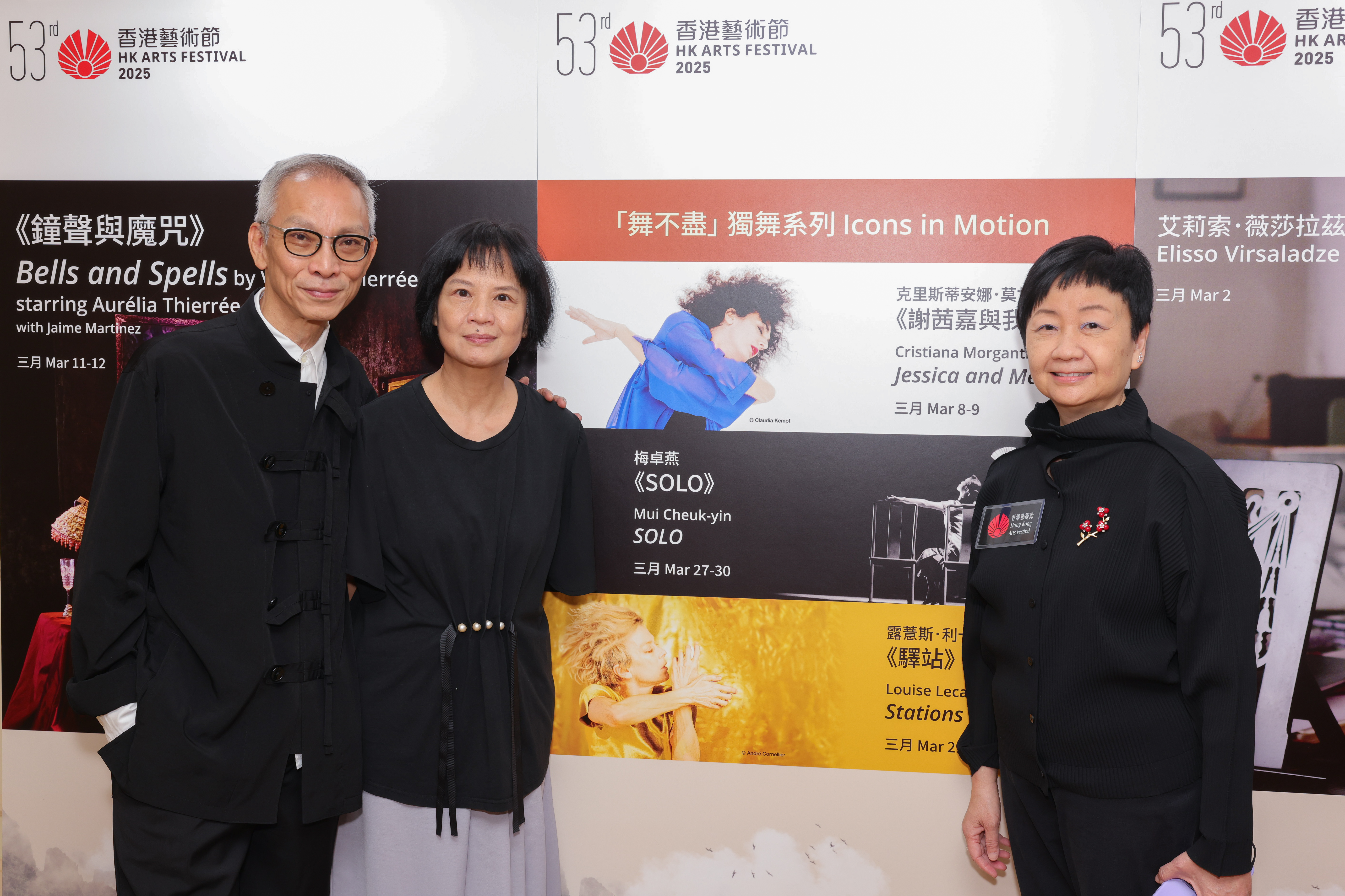 Mr. So Kwok-wan, Programme Director of the Hong Kong Arts Festival Society (left) and Ms. Katy Cheng, Marketing Director of the Hong Kong Arts Festival Society (right) pictured with Ms. Mui Cheuk-yin, the choreographer and performer of SOLO from the series of Icons in Motion (middle).