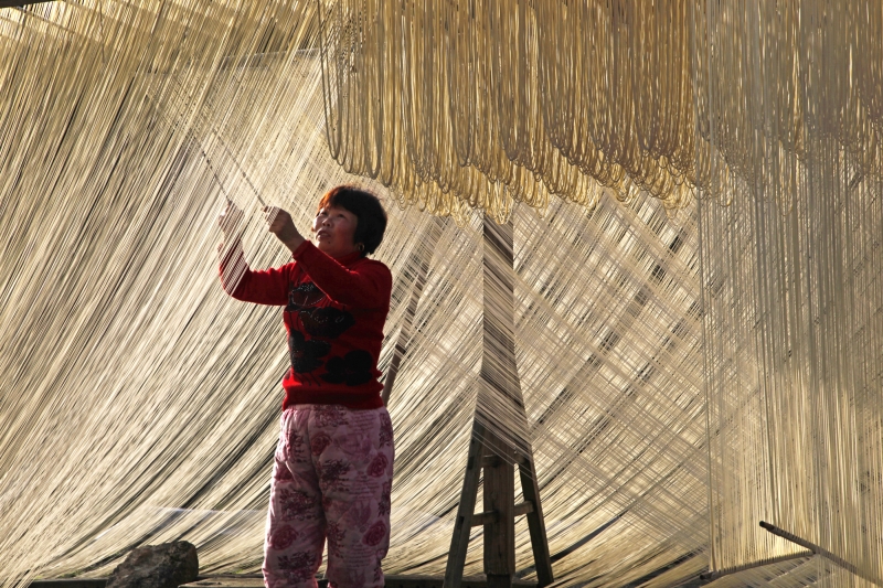 照片描述:时正隆冬,乡间妇女忙於生产掛麵,帮补生计。掛麵是江浙地区农村美食,製作时必须在大太阳和北风天的条件下进行。