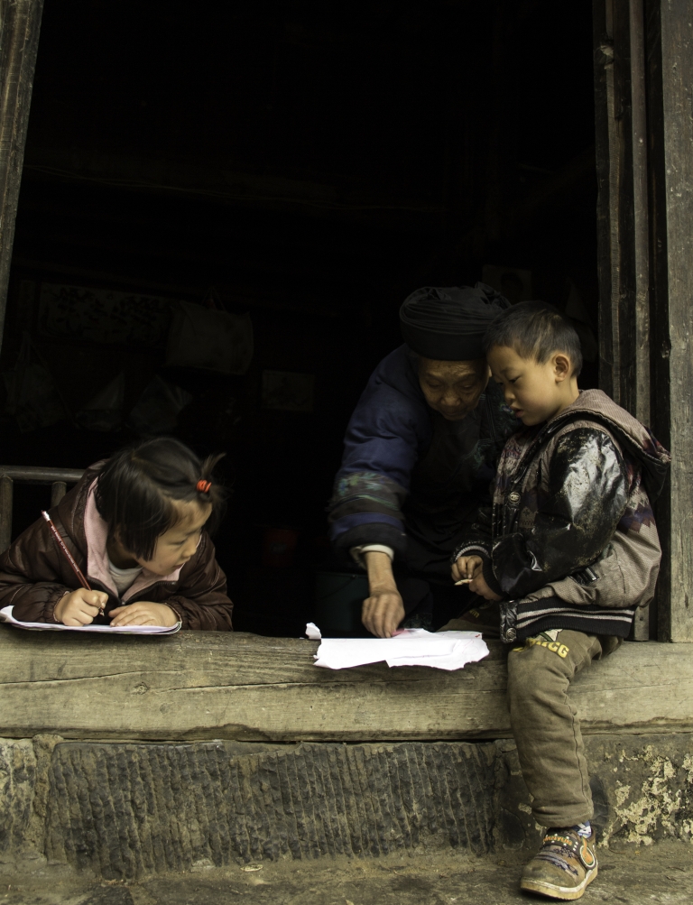 照片描述:本照片中一位奶奶在指导孙子做作业。大山孩子多为留守儿童,年迈的奶奶常年照顾孙子的生活,其艰辛让观者嗟歎。