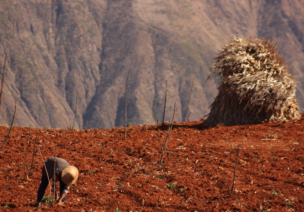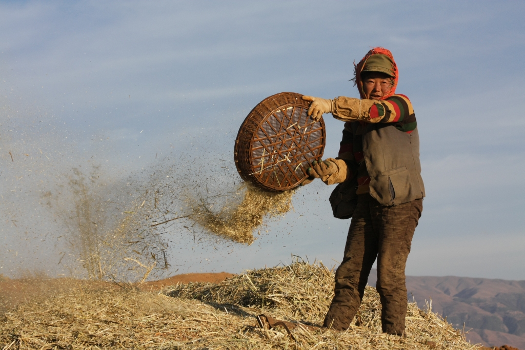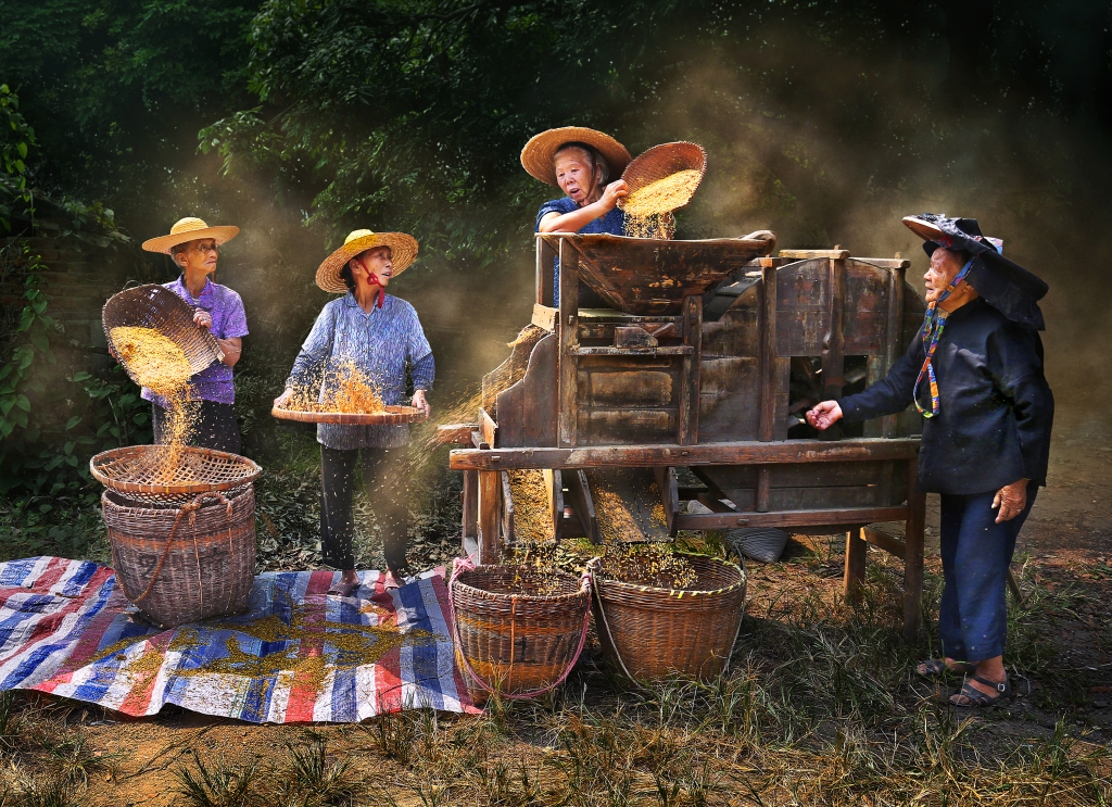 照片描述:面朝红土背朝天,收穫著一年的辛劳。耕耘的女子没有乾净美丽的衣服,没有修长纤细的手指,没有白皙光滑的皮肤,而她们的付出,装满了家中的粮仓。