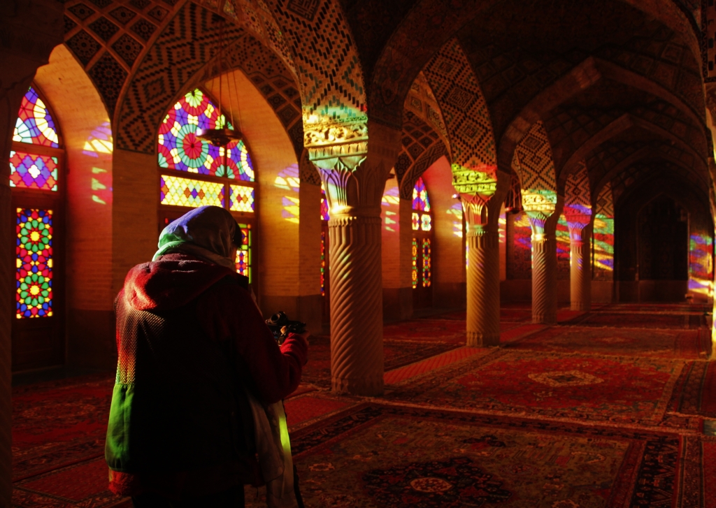 照片描述:虽然这张照片只能看到女摄影师在清真寺裏的背影,但我们仍能感受到她的专注与集中力,全神贯注地完成她的作品-捕捉室内艳丽的彩虹。