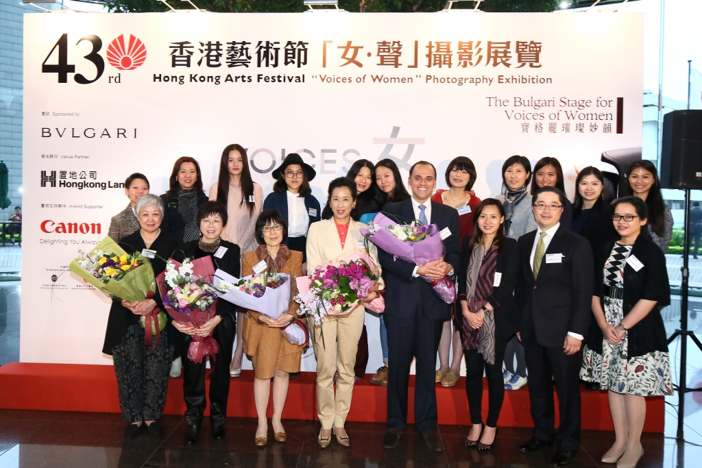 第43届香港艺术节「女•声」摄影比赛最终评审团的成员及赞助机构代表与得奖者在4月9日举行的「女•声」摄影展览开幕塈颁奖典礼合照。