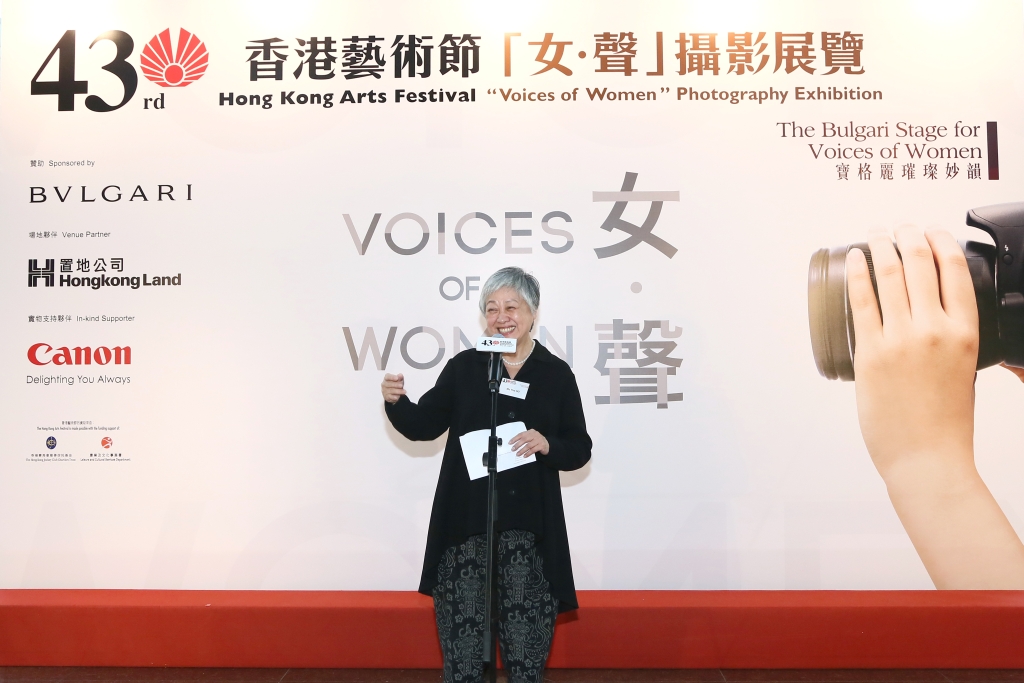香港艺术节行政总监何嘉坤女士在4月9日举行的「女•声」摄影展览开幕塈颁奖典礼致欢迎辞。