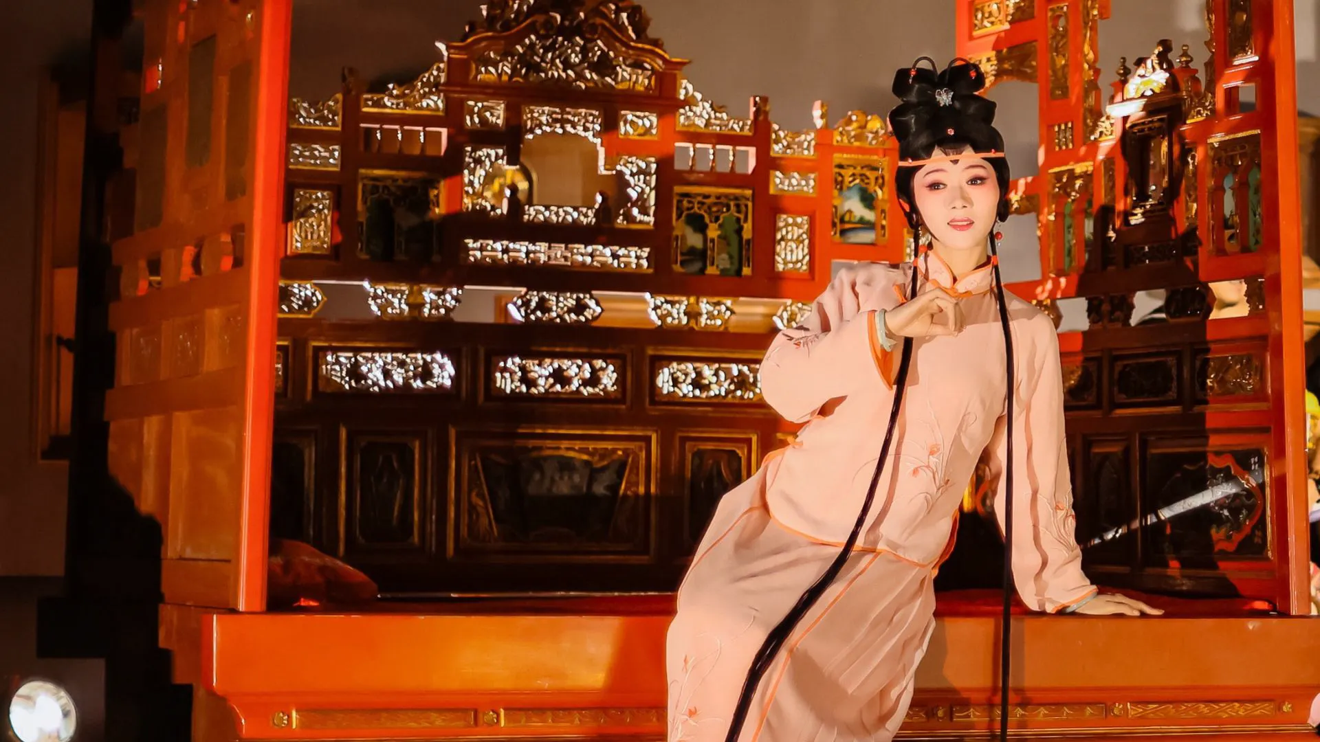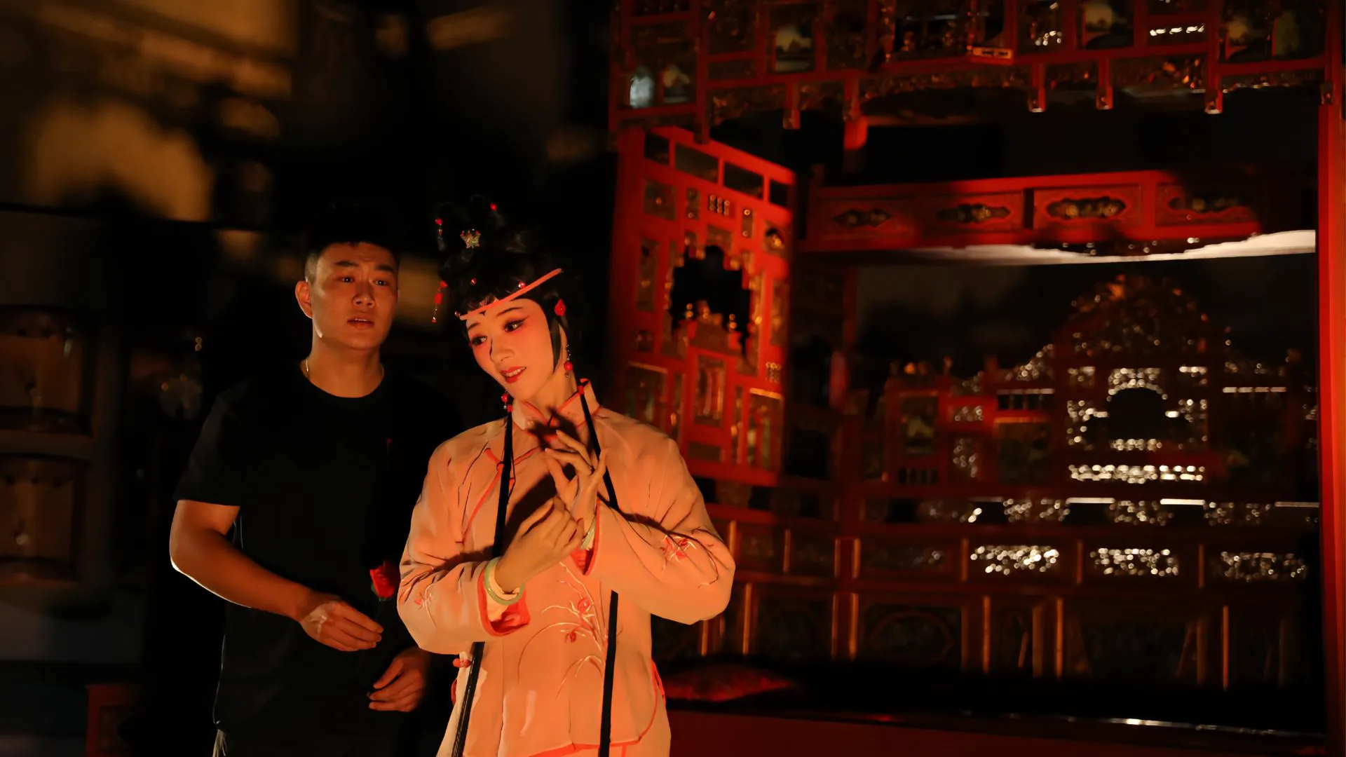 梨園戲擁有近九百年悠久歷史,是現存中國最古老的戲曲劇種之一,被稱為「宋元南戲活化石」,風格古樸典雅。「陳三五娘」的故事原型早見於南宋,明代已有《荔鏡記》劇本刊行,福建省梨園戲傳承中心(原福建省梨園戲實驗劇團)於1954 年按古本《陳三》整編為《陳三五娘》後,一直是梨園戲中最廣為流傳且影響最深遠的劇目。面對經典,梨園戲新生代以尊重傳統並勇於創新的精神,將之改編為「平行時空《陳三五娘》」,於2023 年深圳蛇口戲劇節首演。《紅眠床》再接再厲,以獨角戲名折〈大悶〉為主線,貫穿〈睇燈〉、〈投荔〉、〈磨鏡〉、〈留傘〉等《陳三五娘》的經典場口,同時展現當代梨園戲青年傳承人的掙扎與探索,戲裏戲外,互為交融、延伸,情感真摯。